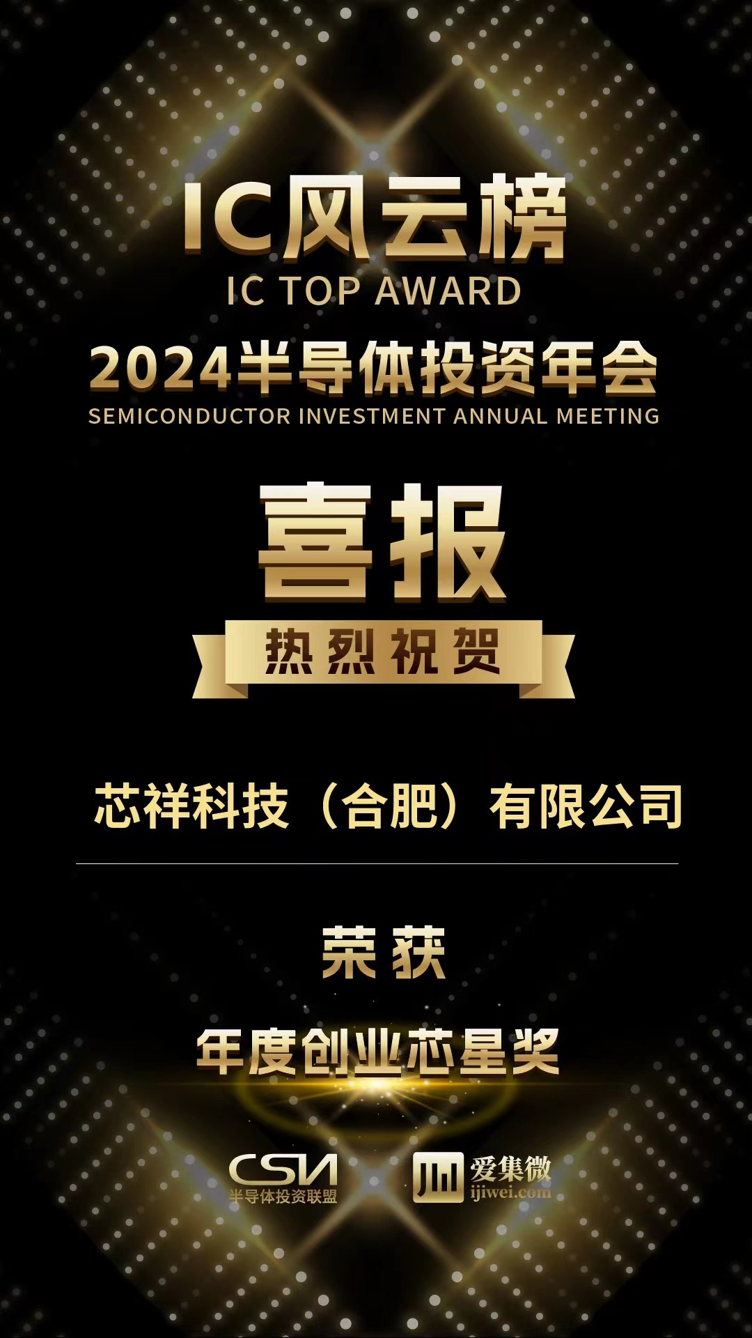 2023年12月16日,由半导体投资联盟主办、爱集微承办,以“重组创变,整合致胜”为主题的2024半导体投资年会暨IC风云榜颁奖盛典在北京圆满举办。经过500+半导体行业CEO与半导体投资联盟的100多家会员单位评审后,芯祥科技(合肥)有限公司荣获“年度创业芯星奖”。